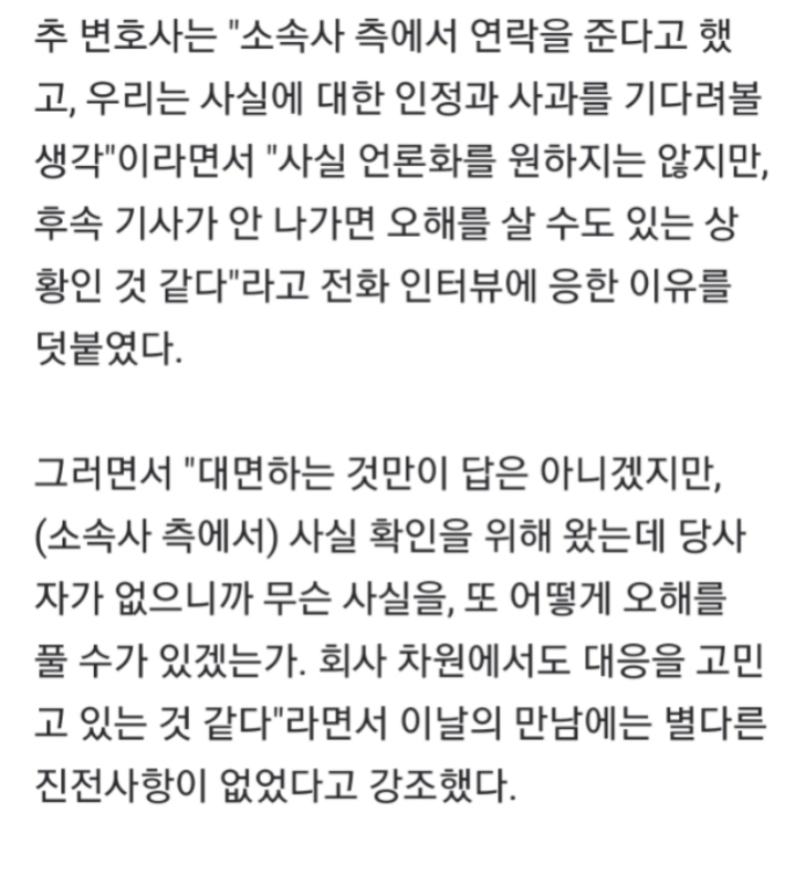 그는 만남을 거절했다고 밝히며 "왜 동생과 소속사 법무 담당하시는 분들이 접촉해야 하는지 참 이해가 안 됐다. 가해자 없이 대리인과 피해자만 만나면 어떻게 맞고 틀림을 확인할 수 있나"라고 불편한 심기를 드러냈습니다.