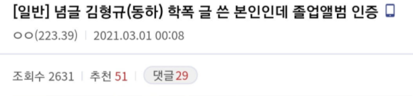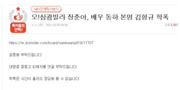 동하에 대한 학폭 폭로가 올라온 것은 2021년 3월 4일입니다. 요즘 학폭 폭로의 주요 무대가 되고 있는 네이트 판에는 '오 삼광빌라 장준아, 배우 동하 본명 김형규 학폭'이라는 제목의 글이 올라왔습니다.