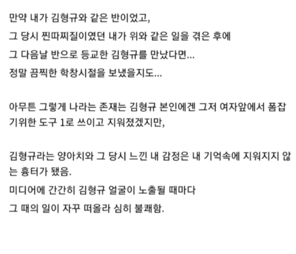 글쓴이는 또 "장소가 유동인구가 많은 곳이었던 까닭에 두려움 못지않게 수치심도 굉장히 컸지만 지금 돌이켜보면 어두운 골목이 아니라서 그나마 다행이었다는 생각이 든다"며 "그때 내가 느낀 복잡한 감정은 차치하고, 평소 그와 그의 형에 관련된 센 소문을 들은 적이 있기에 찍히지 않기 위해서 그 다음부터는 학교에서 어떻게든 김형규 눈에 띄지 않으려 숨어다녀야 했다"고 털어놨습니다.