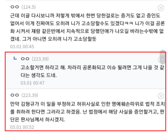 끝으로 "나라는 존재는 김형규 본인에겐 그저 여자 앞에서 폼잡기 위한 도구 1로 쓰이고 지워졌겠지만, 김형규라는 양아치와 그 당시 느낀 내 감정은 내 기억 속에 지워지지 않는 흉터가 됐다"며 "미디어에 간간히 김형규 얼굴이 노출될 때마다 그 때의 일이 자꾸 떠올라 심히 불쾌하다"고 덧붙였습니다.
