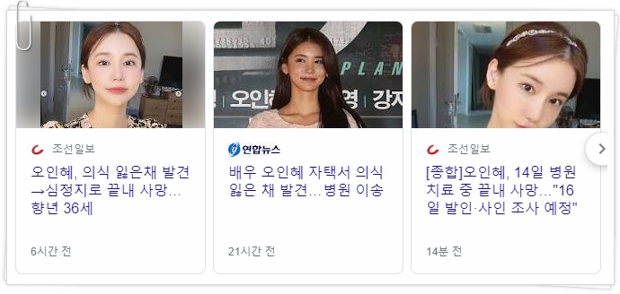 배우 오인혜(36)가 자택서 의식을 잃은 채 발견돼 병원으로 이송됐으나 끝내 사망했다. 오인혜는 9월 14일 오전 인천 송도 자택에서 심정지 상태로 발견돼 병원으로 옮겨져 치료를 받았으나 결국 사망하고 말았다.