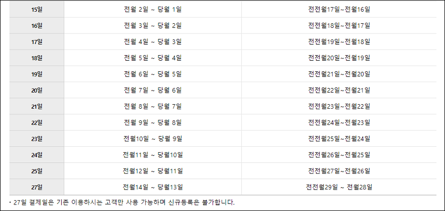결제일별 이용기간은 다음과 같습니다. 특이사항으로는 27일의 경우 기존 이용하던 고객만 사용 가능하며 신규등록은 불가능하다는 점입니다. 사람들이 가장 많이 사용하는 일은 14일과 월급날입니다. 돈 관리를 수월하게 하고 싶으신 분들은 14일을 추천드립니다.