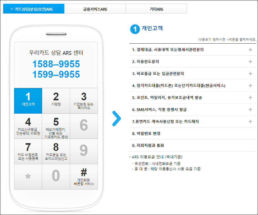 우리카드 콜센터 전화번호는 1588-9955 또는 1599-9955입니다. 상담시간은 평일 오전 9시부터 오후 6시까지 운영하고 있으니 변경을 원하시는 분들은 상담시간 내 전화하셔서 변경하시면 됩니다.