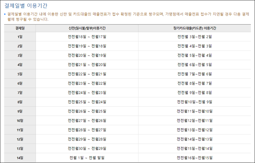 결제일별 이용기간이 중요한 이유는 결제일에 따라 이용대금 청구기간이 다르기 때문이며 간혹 이것 때문에 연체가 되는 경우가 발생해 신용등급 하락에 영향을 미칠 수 있어 주의해야합니다.