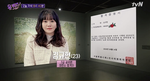 특히, 김규현 주무관은 2020년 유퀴즈에 출연해 주목을 받았습니다. 예쁜 외모에 재치있는 말솜씨로 더 주목받았던 그녀는 경희대 연극영화과 재학 중에 7급 공무원 시험에 합격했습니다. 만 20세 나이, 최연소 합격 기록이었습니다.