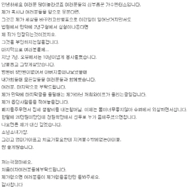 징역2년을 구형받아 팬들에게 자신의 아내와 아이를 도와달라는 내용이었습니다.