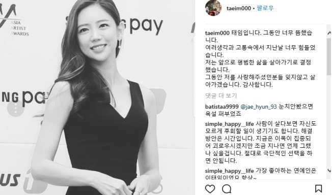 현재 소속사는 공식입장을 발표하지 않고 있으며 은퇴 선언 이후 이태임은 이틀째 연락이 두절된 상태다. 19일 새벽에는 SNS에 “고통 속에서 지난 나날이 너무 힘들었다”며 “그동안 사랑해주셨던 분들 잊지 않고 살아가겠다”는 글을 올리기도 했다.