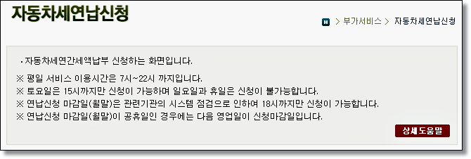 자동차세 연납신청은 평일 오전 7시부터 오후 10시까지 가능합니다. 토요일은 3시까지 신청이 가능하니 참고하면 좋을 듯합니다. 마감일은 시스템 점검으로 인해 오후 6시까지 진행한다고 하니 늦지 않게 신청하시면 좋을 듯합니다.