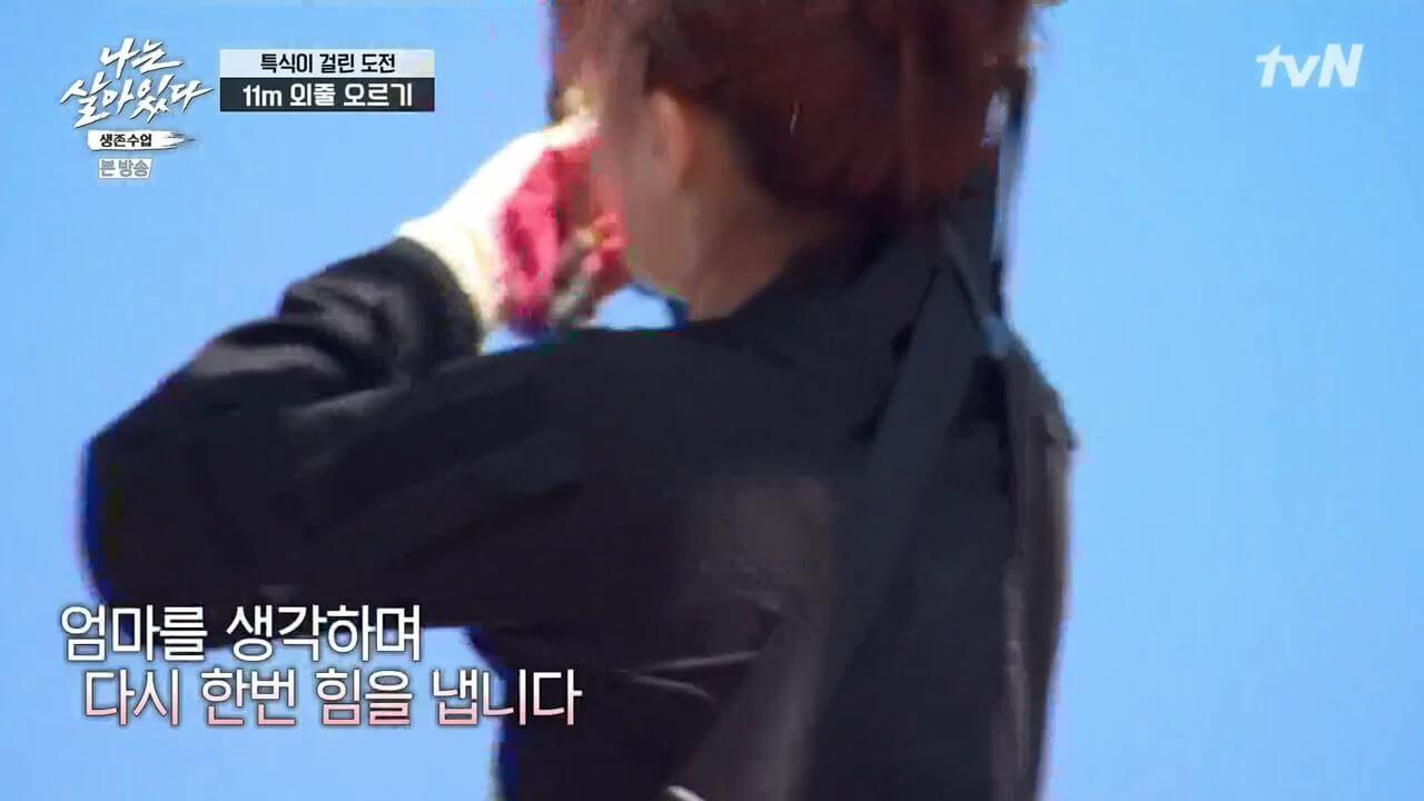 그렇게 이시영은 실패하고, 다음은 우기의 차례였는데요. 중간쯤에 힘이 빠져서 매달려있다가 실패를 했습니다. 하지만 오정연이 갑자기 "살아야 엄마 본다"는 말에 정신이 든 우기는 "엄마" 외치며 거침없이 외줄 타서 11m 정상을 찍는데 성공 했습니다. 비록 실패 했지만 끝까지 포기 하지 않은 우기의 감동적인 장면 이였던거 같네요.