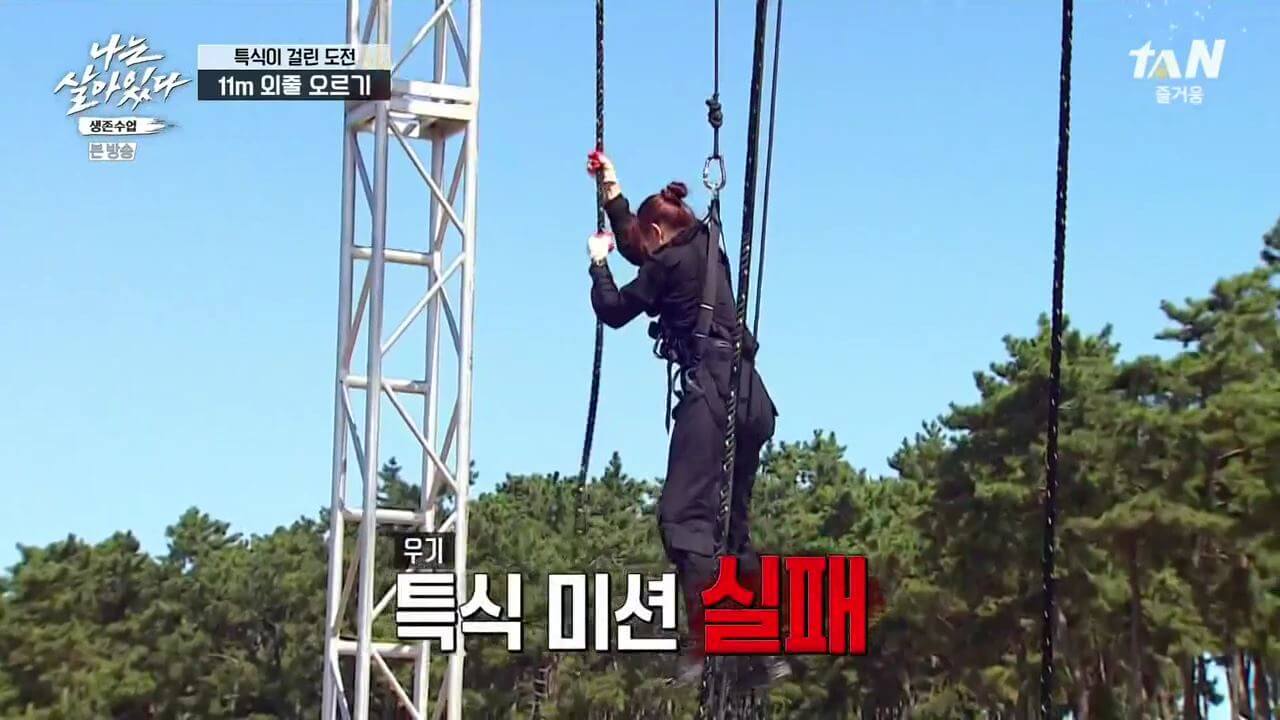 이날 교육생들은 11m의 외줄 오르기 미션을 도전했는데요. 박은하 교관은 교육생들중에서 한명만 성공해도 모두 성공한 걸로 쳐준다고 했습니다. 그만큼 어려웠던 미션이었던거 같습니다. 왜냐하면 온전히 체중을 팔, 다리에 실어야 하기 때문인데요.