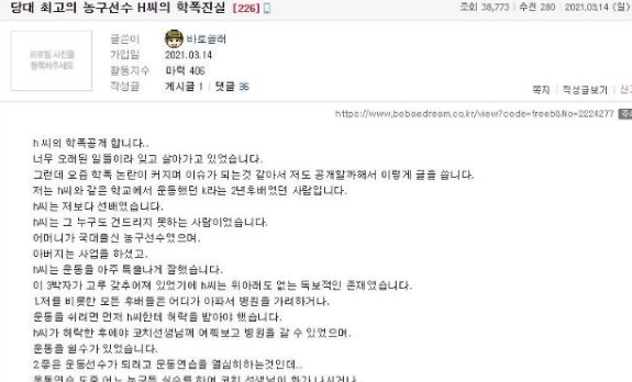 14일 온라인 커뮤니티 보배드림에는 '당대 최고의 농구선수 H씨의 학폭 진실'이라는 제목의 글이 게재됐다.