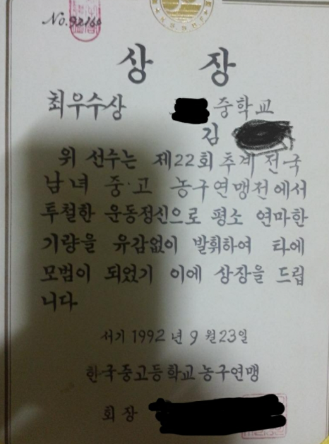 A씨는 자신이 H씨와 같은 학교에서 운동을 했던 2년 후배였다며 상장 사진을 공개했다.