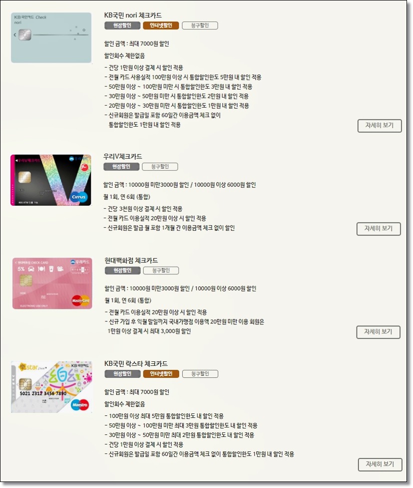 체크카드도 굉장히 많은 할인을 해주고 있었는데요. 국민은행 카드의 경우 전월 실적에 따라 할인이 적용되는데 최대 7,000원까지 가능합니다. 그 외에 6,000원 할인되는 것도 있고 이보다 더 많이 되는 것들도 있으니 공식 홈페이지에 들어가 확인해보시기 바랍니다.