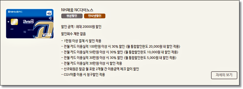 NH농협카드의 경우 최대 20,000원까지 할인이 됩니다. 인상적인 것은 할인회수 제한이 없는 것인데요. 전월 카드 이용실적에 따라 통합할인한도가 정해져있으니 참고하신 후 혜택을 적용하면 될 것 같습니다. 신규회원인 경우 2개월 간 이용금액 상관없이 적용됩니다.