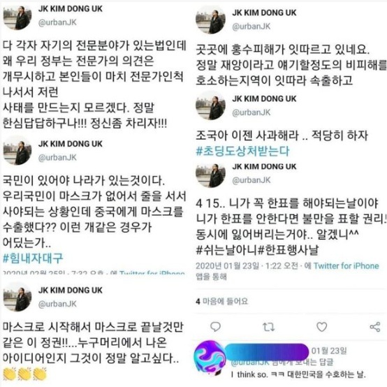 JK김동욱은 이전에도 현 정권에 비판적인 글을 트위터에 올려 화제가 된 바 있다.