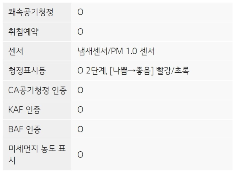 기능으로는 쾌속 공기 청정, 냄새 센서, 초미세, 극 초미세, 미세먼지 농도 표시, 청정 표시, 스마트폰 연결 등 다양한 기능을 가지고 있습니다. 아래 표를 참고해 주세요.