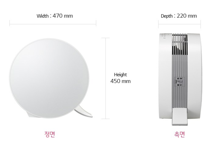 사이즈는 47x45x22cm로 작으며 무게가 7.2kg 정도여서 이동이 편리합니다. 공기 청정 면적은 약 11평 정도 됩니다. 저희 집에 딱 맞네요^^