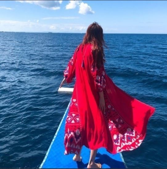 붉은색 겉옷을 입고 요트 위를 거니는 등