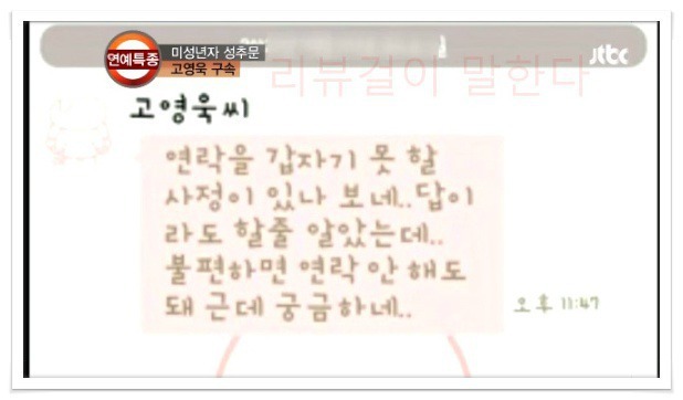 위에 통화내용 이미지는 JTBC 1월4일 연예특종 1월4일 방송분에서, 자숙중이던 고영욱으로부터 만남을 제안받았다는 제보자와의 인터뷰 내용입니다.