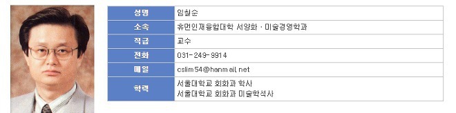 그래도 찾아낸 정보로는 임철순 교수는 경기대학교 휴먼인재융합대학 서양화.미술경영학과 교수로 재직중이구요. 학력은 서울대학교 회화과, 미술학 석사학위를 갖고 있네요.