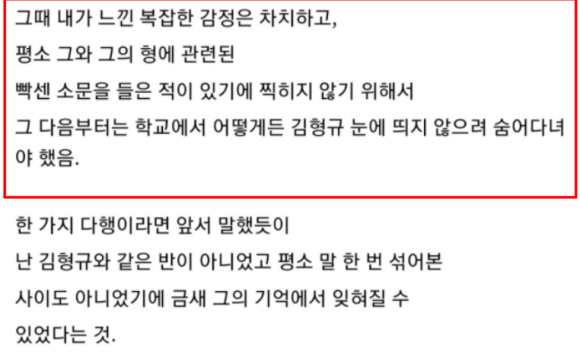 그때 내가 느낀 복잡한 감정은 차치하고, 평소 그와 그의 형에 관련된 빡센 소문을 들은 적이 있기에 찍히지 않기 위해서 그 다음부터는 학교에서 어떻게든 김형규 눈에 띄지 않으려 숨어다녀야 했음.
