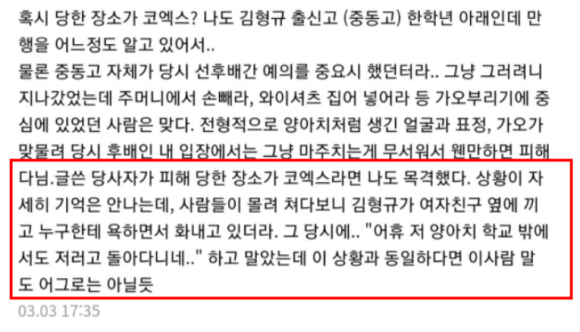 글쓴이는 또 "장소가 유동인구가 많은 곳이었던 까닭에 두려움 못지않게 수치심도 굉장히 컸지만 지금 돌이켜보면 어두운 골목이 아니라서 그나마 다행이었다는 생각이 든다"며 "그때 내가 느낀 복잡한 감정은 차치하고, 평소 그와 그의 형에 관련된 센 소문을 들은 적이 있기에 찍히지 않기 위해서 그 다음부터는 학교에서 어떻게든 김형규 눈에 띄지 않으려 숨어다녀야 했다"고 털어놨습니다.